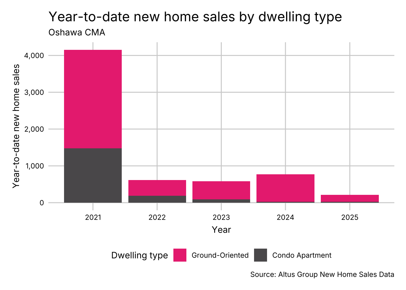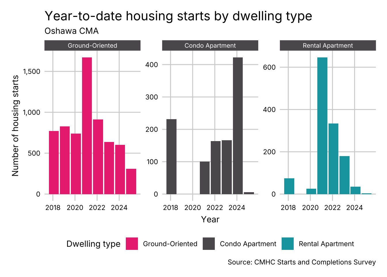 Housing starts in Oshawa CMA have declined significantly compared to the same point in previous years.