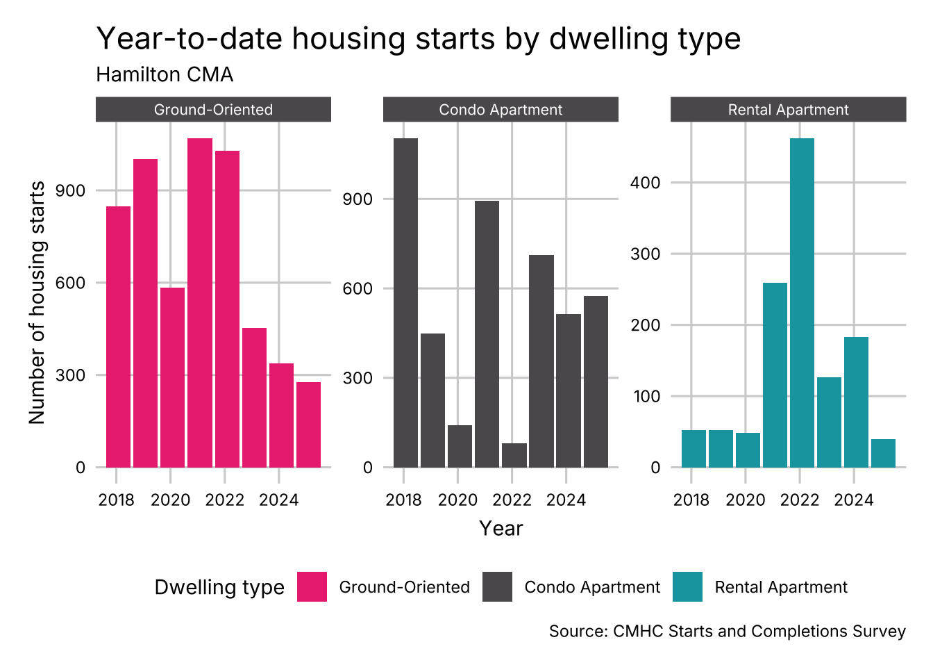 Housing starts in Hamilton CMA have declined significantly compared to the same point in previous years. Starts of rental apartments are holding up better than ground-oriented or condo apartment homes.