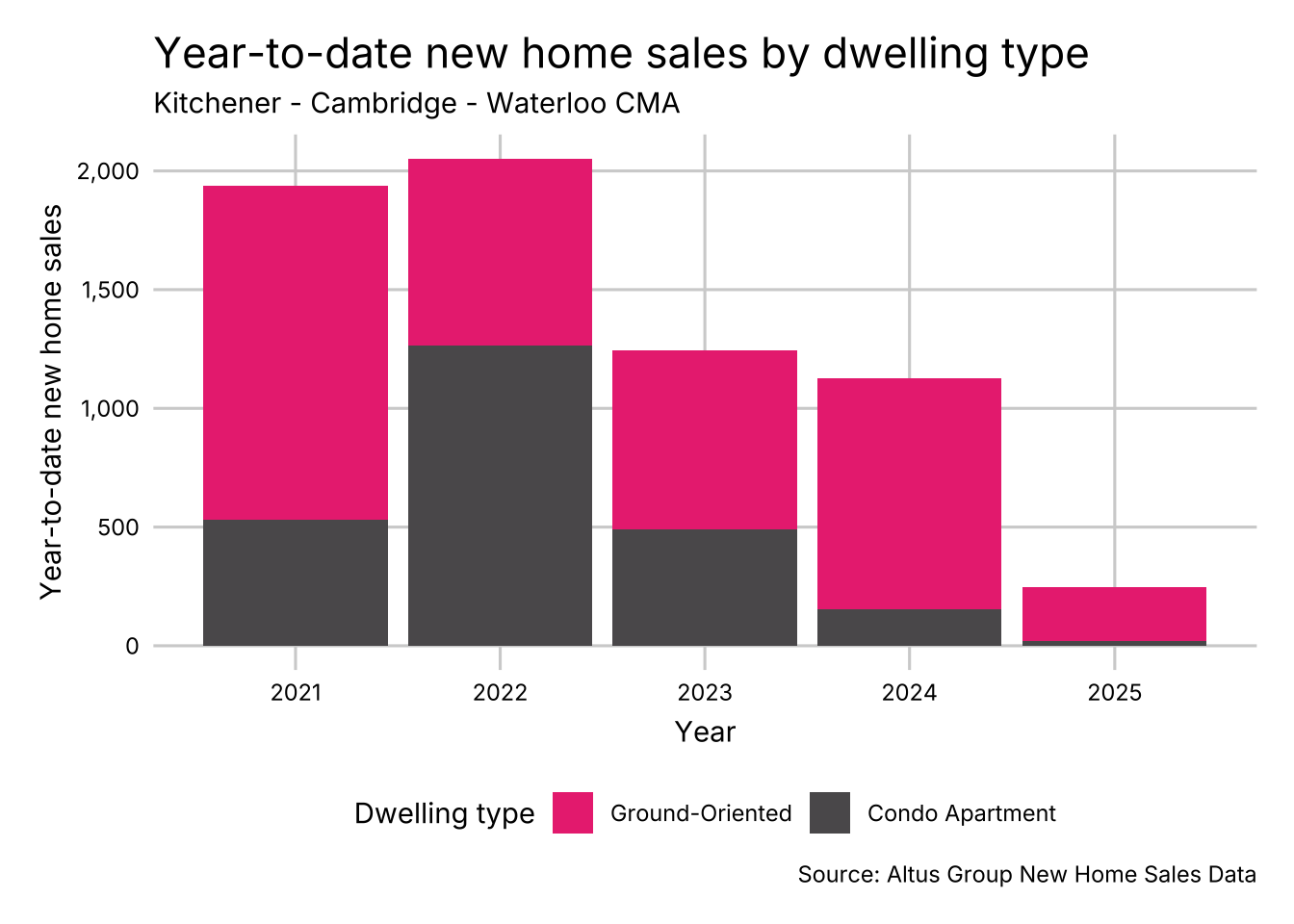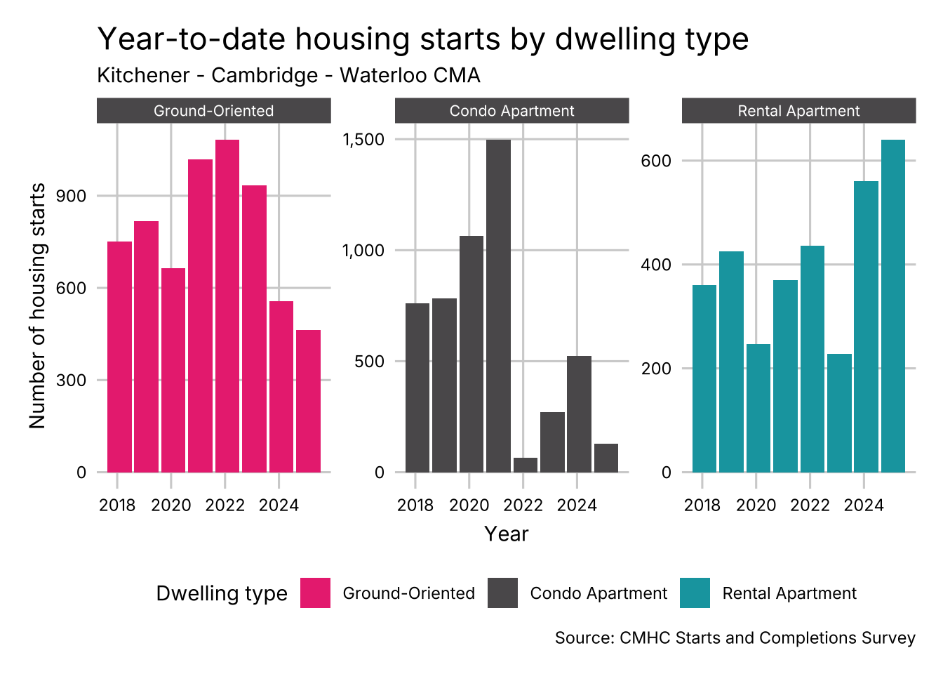 Housing starts in Kitchener-Waterloo-Cambridge CMA have declined significantly compared to the same point in previous years.