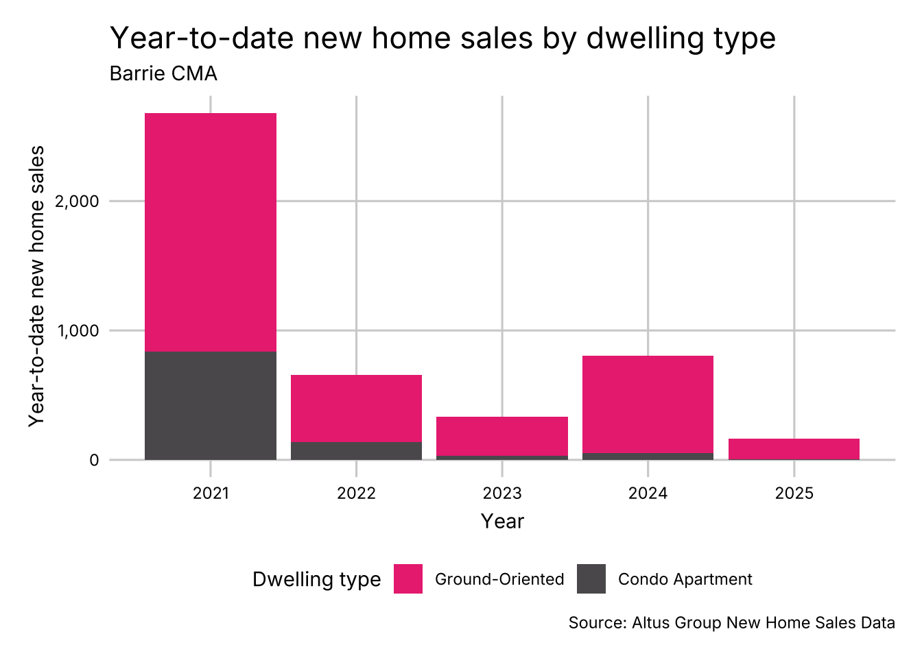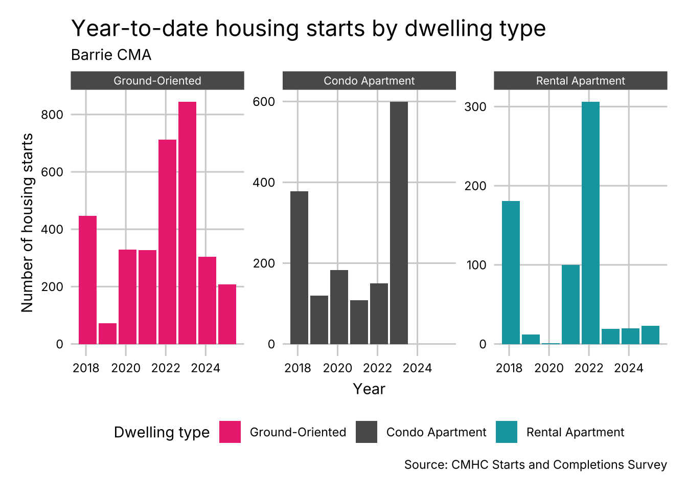 Housing starts in Barrie CMA have declined significantly compared to the same point in previous years. Ground-oriented starts have seen the smallest decline.